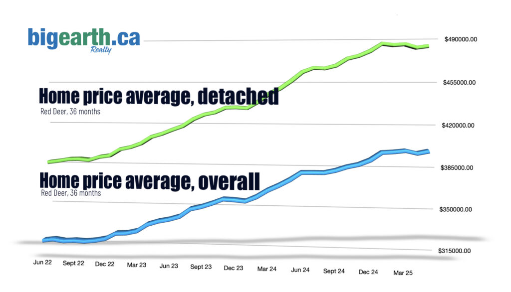 I share the average home price in Red Deer each month based on homes sold the previous month. This includes all types of homes—semi-detached, townhomes, apartments, and detached homes. I also track the prices of detached homes separately.