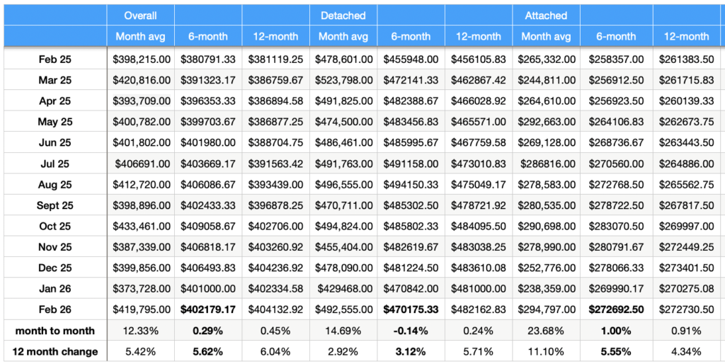 Detached prices showed the largest swing, which is common because higher-priced sales influence this segment the most. February’s rebound suggests demand remained steady and that January’s dip was more about timing than a true market shift.