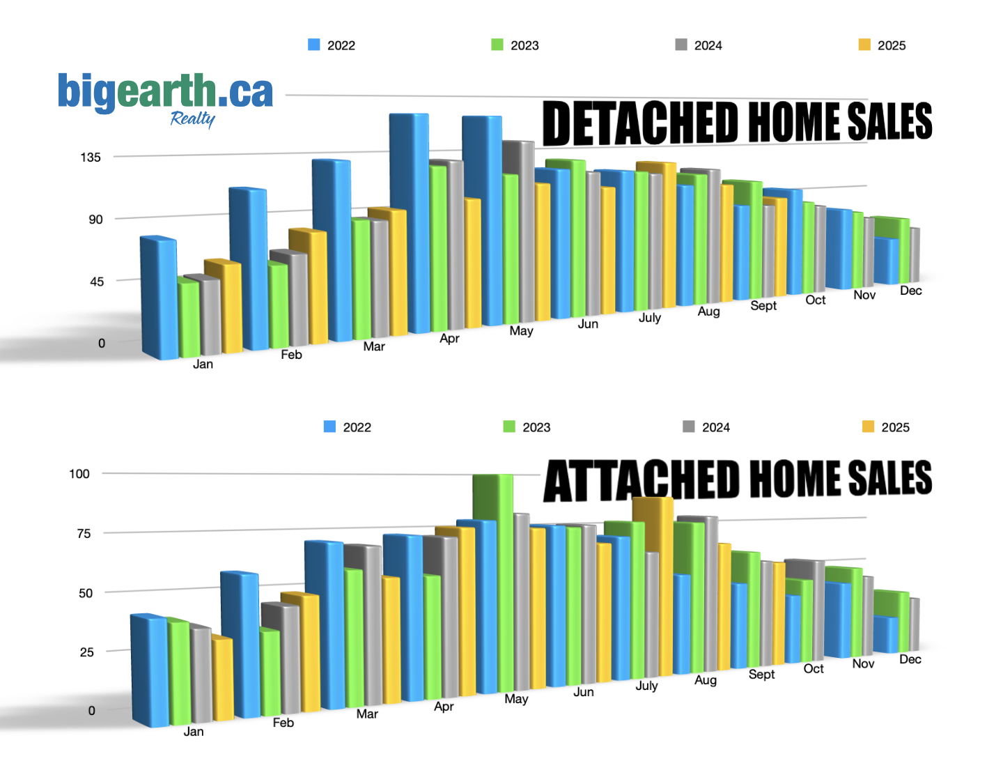 February (+8.9%), April (+5.6%), and especially July (+44%) all saw strong activity. The surge in July attached home sales may indicate growing demand for more affordable housing options as detached prices remain high.